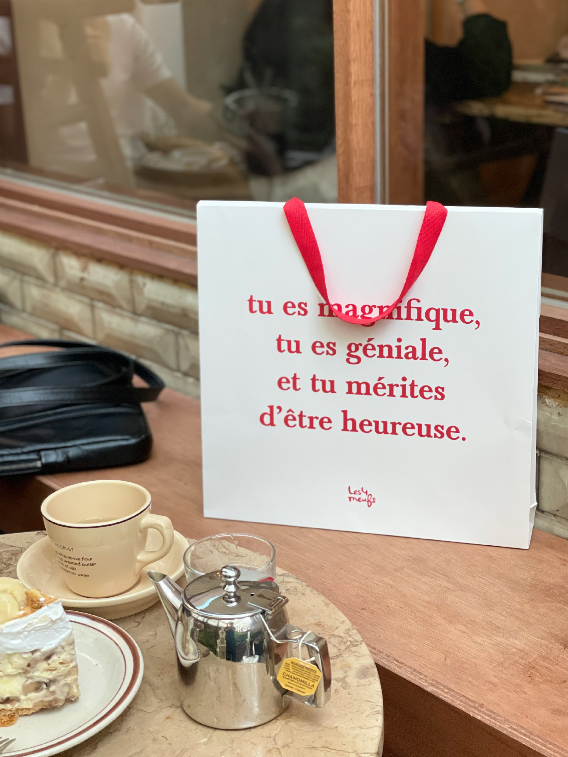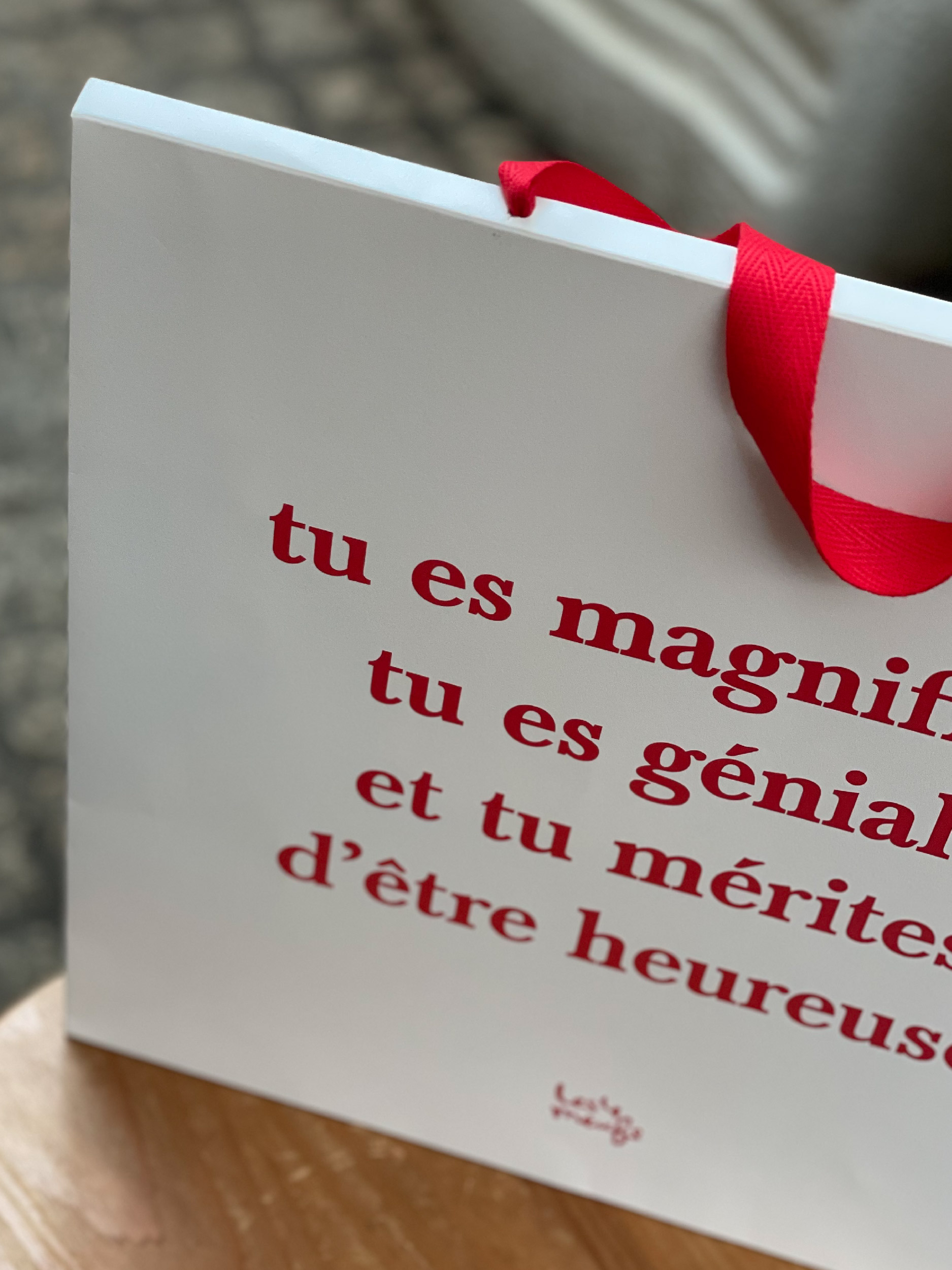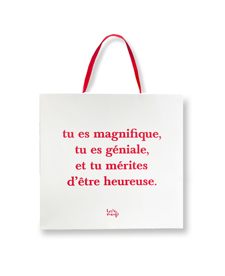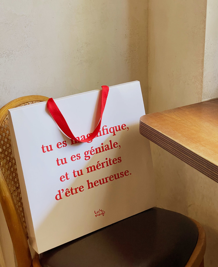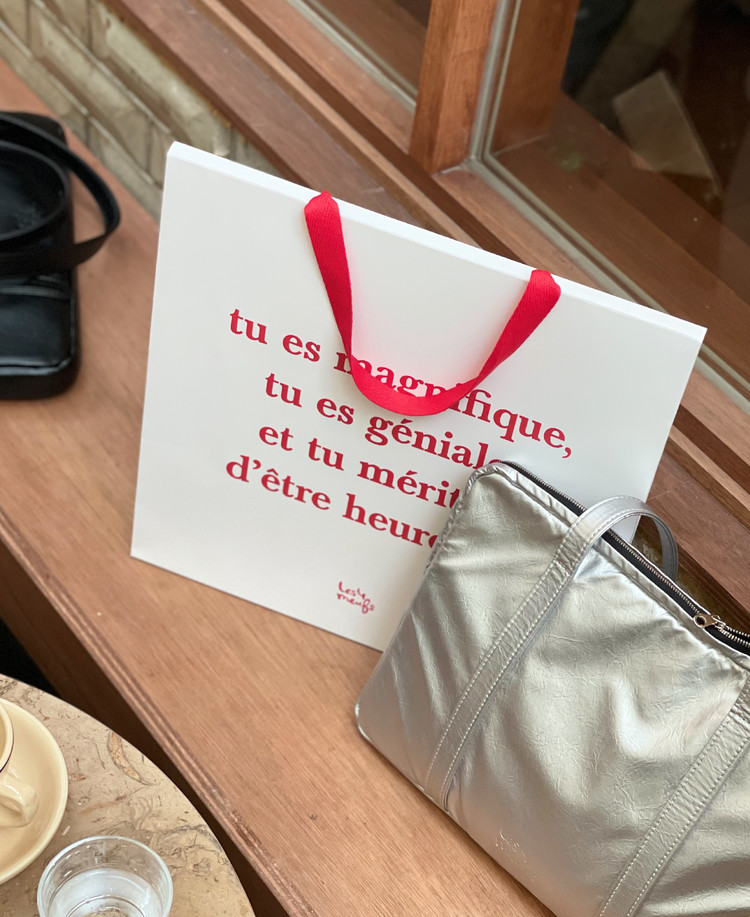 핸들이 달린 박스형 쇼핑백, 로고 원형 스티커, 선택하신 미니 메시지 카드 각 1장 씩 세트로 구성되어 있으며, 레꺄트흐 메프의 모든 가방이 단품으로 들어가는 사이즈입니다.
