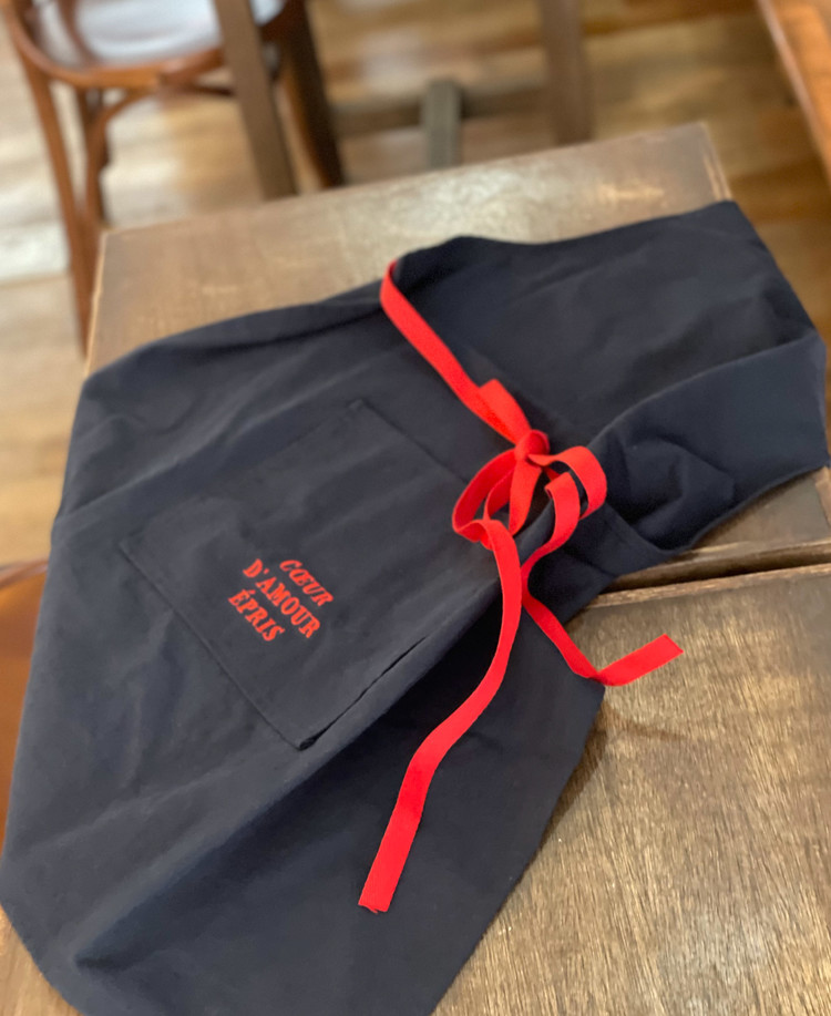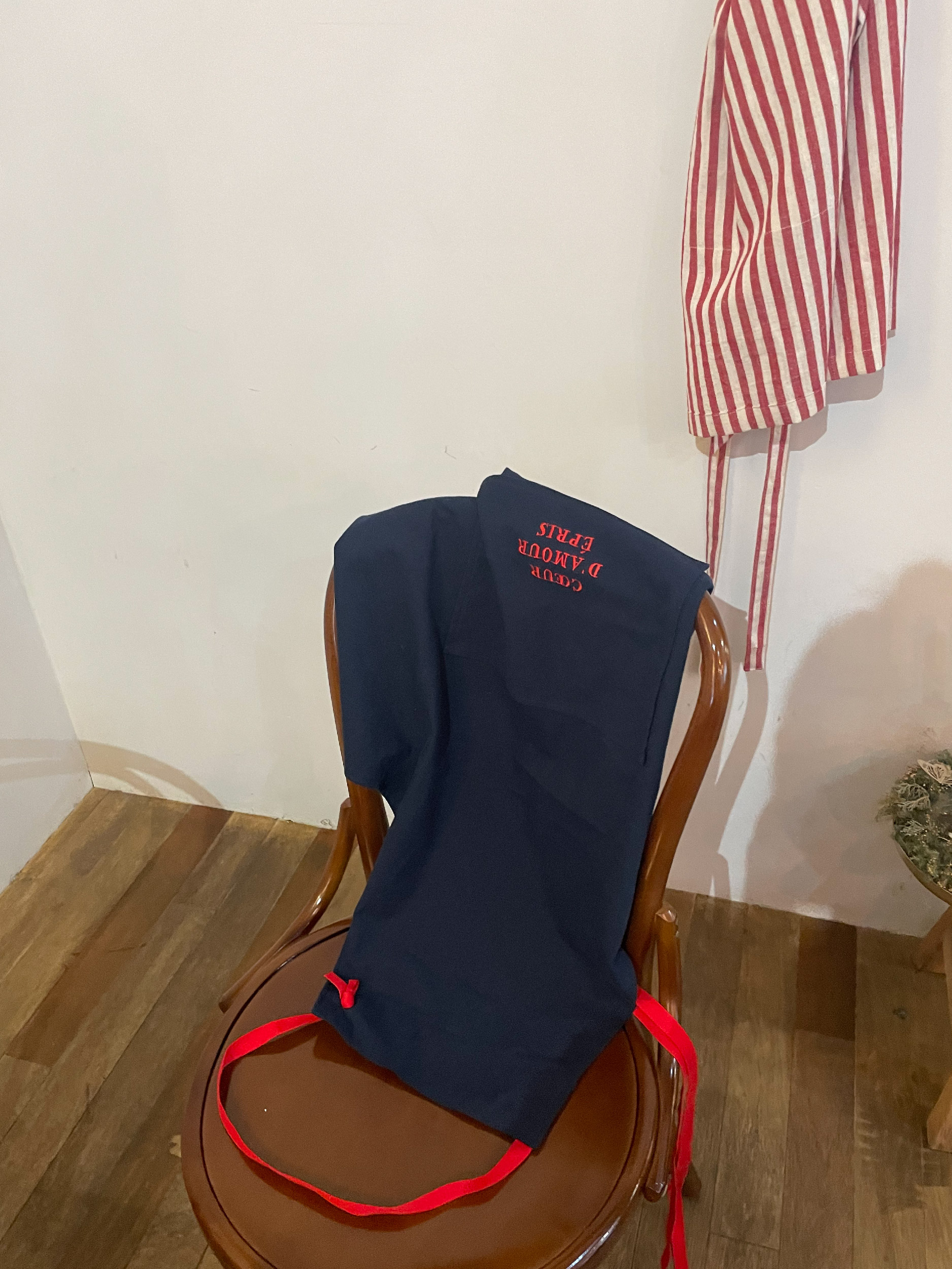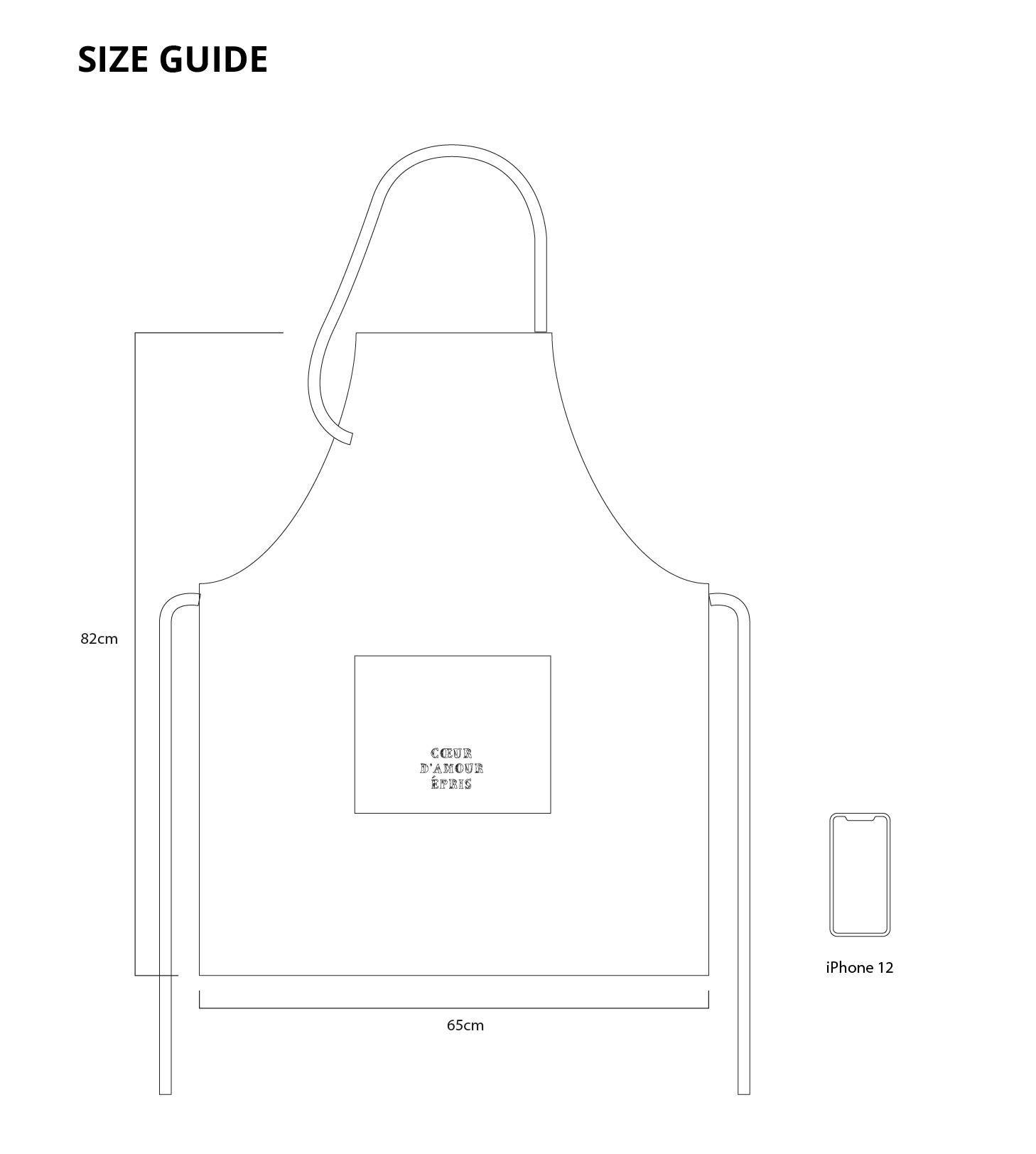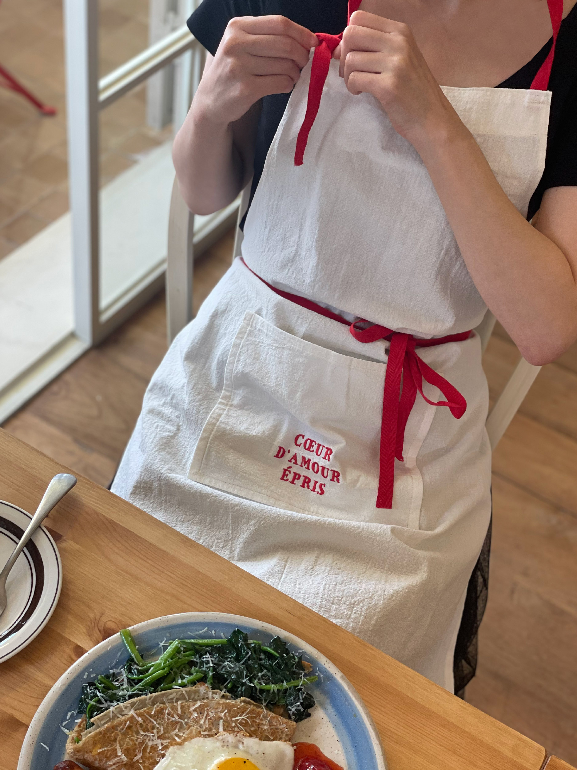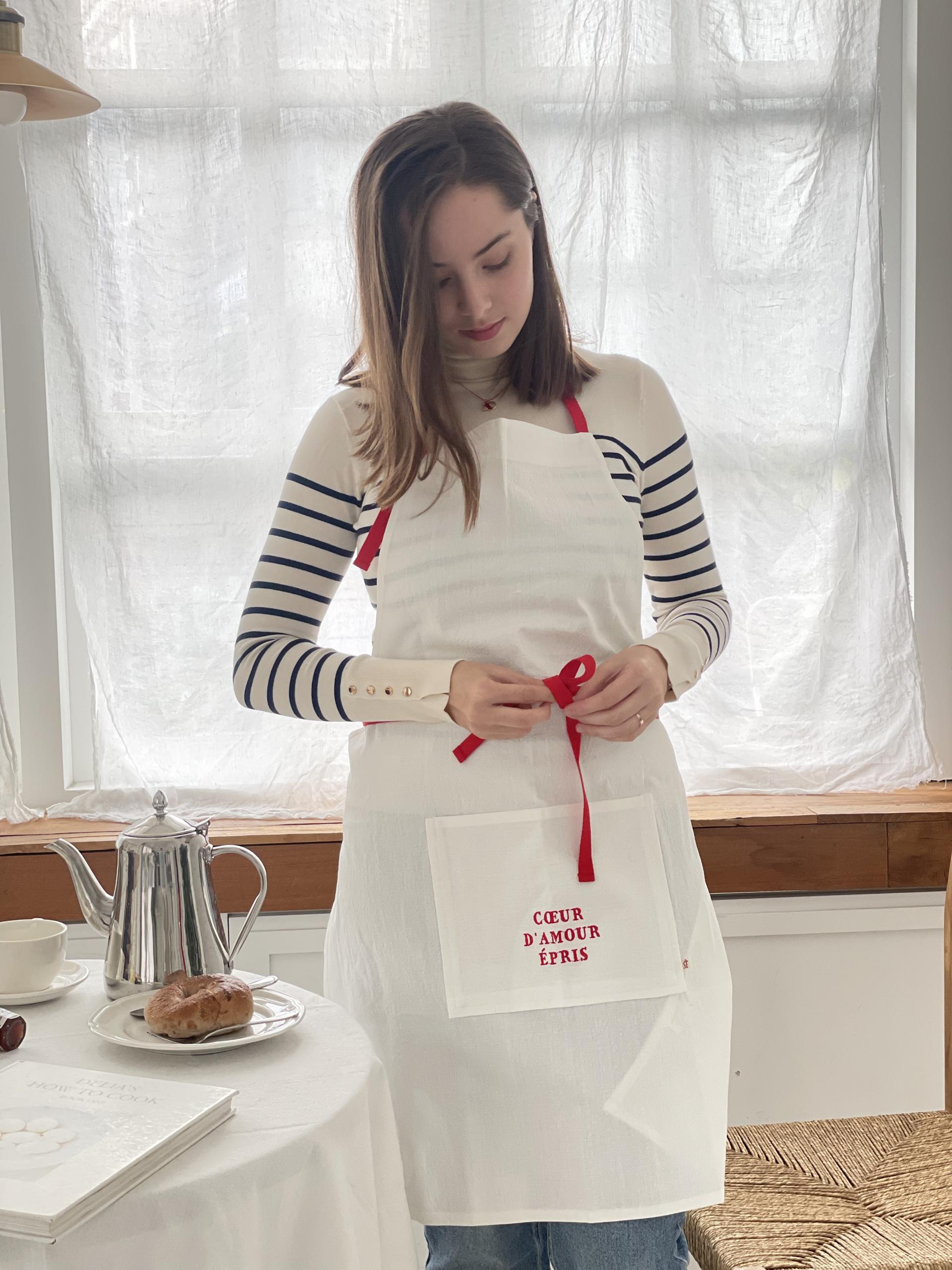 앙리 마티스의 유명한 글귀인, “사랑에 빠진 마음”이란 뜻의 Cœur d'amour épris 가 자수로 들어간 앞 주머니는 사랑스러움과 편의를 더합니다. 어깨부분에서 리본으로 길이 조절이 가능한 원피스형 앞치마로, 반을 접어 하프앞치마로도 활용 가능합니다. 분주하고 바쁜 키친 라이프에 감미로운 분위기를 더해보세요.