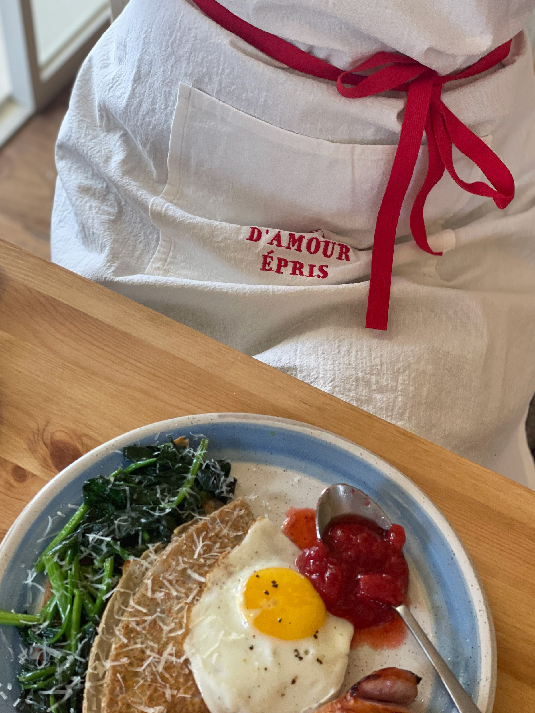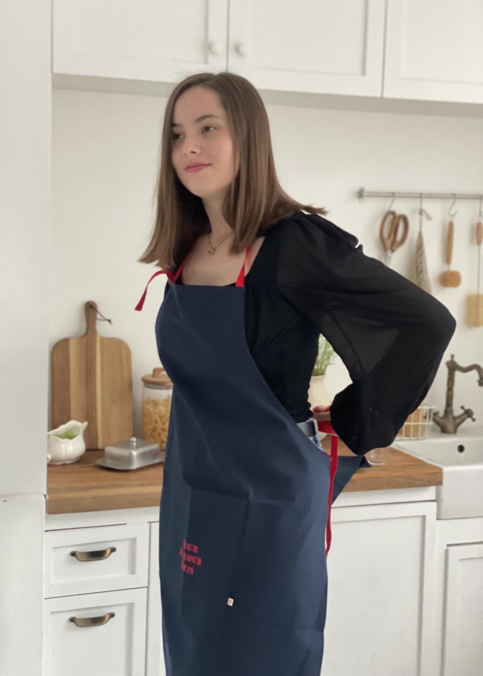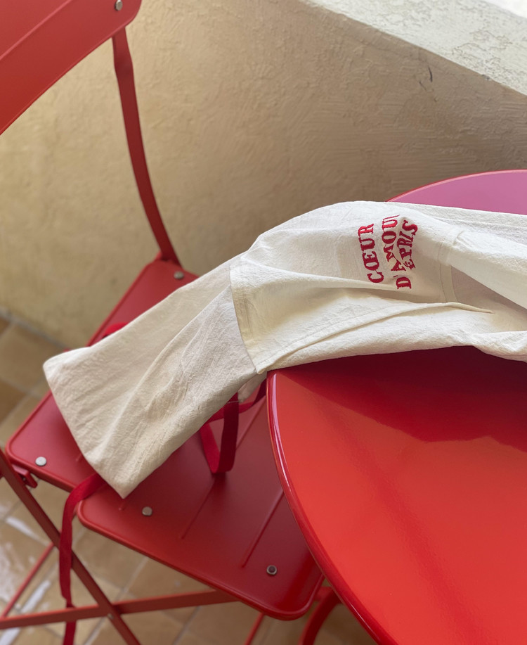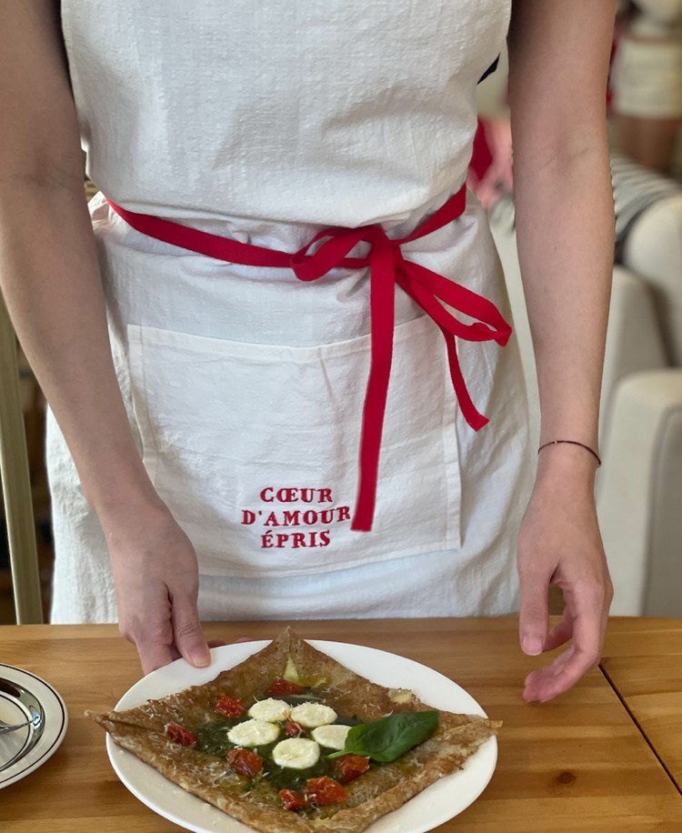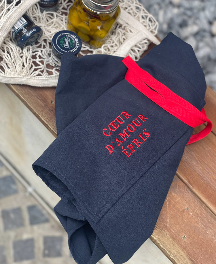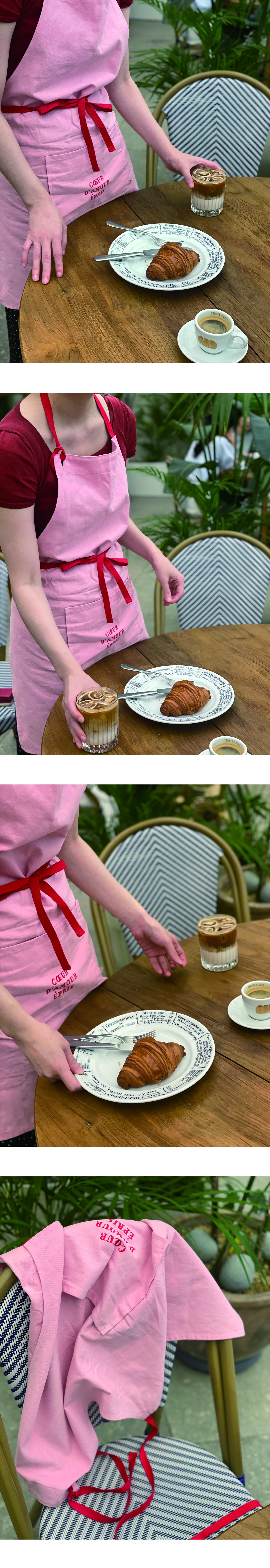 앙리 마티스의 유명한 글귀인, “사랑에 빠진 마음”이란 뜻의 Cœur d'amour épris 가 자수로 들어간 앞 주머니는 사랑스러움과 편의를 더합니다. 어깨부분에서 리본으로 길이 조절이 가능한 원피스형 앞치마로, 반을 접어 하프앞치마로도 활용 가능합니다. 분주하고 바쁜 키친 라이프에 감미로운 분위기를 더해보세요.
