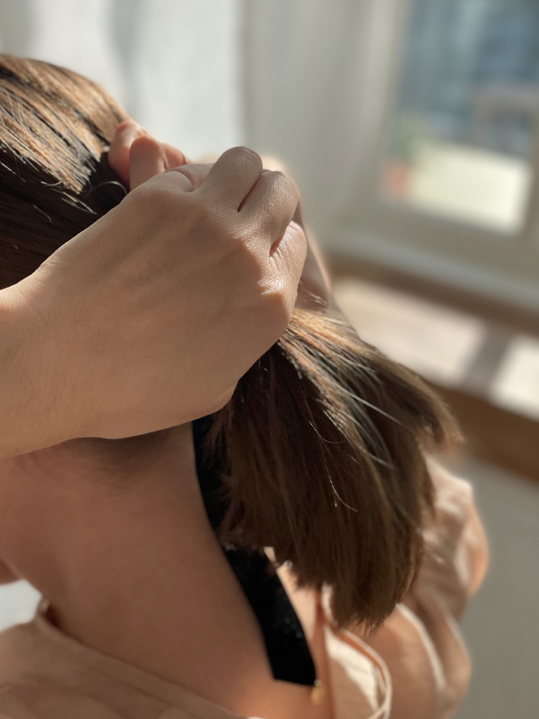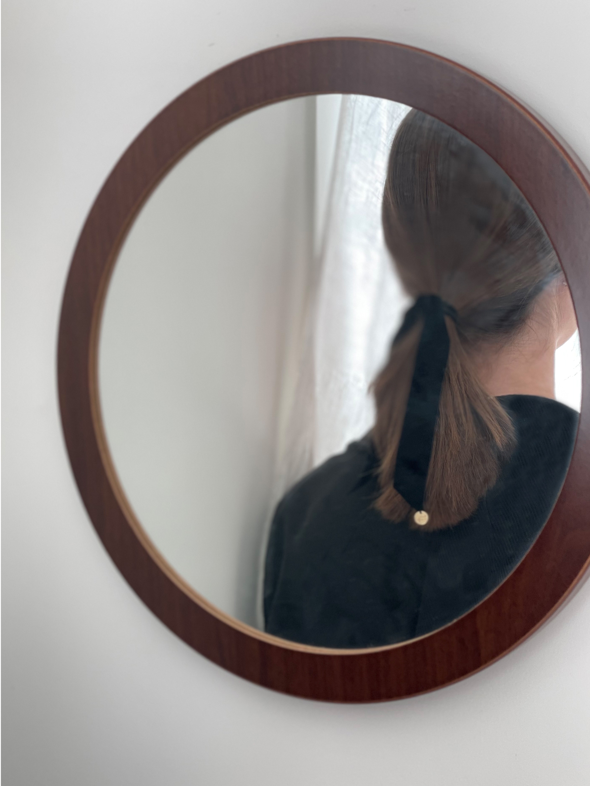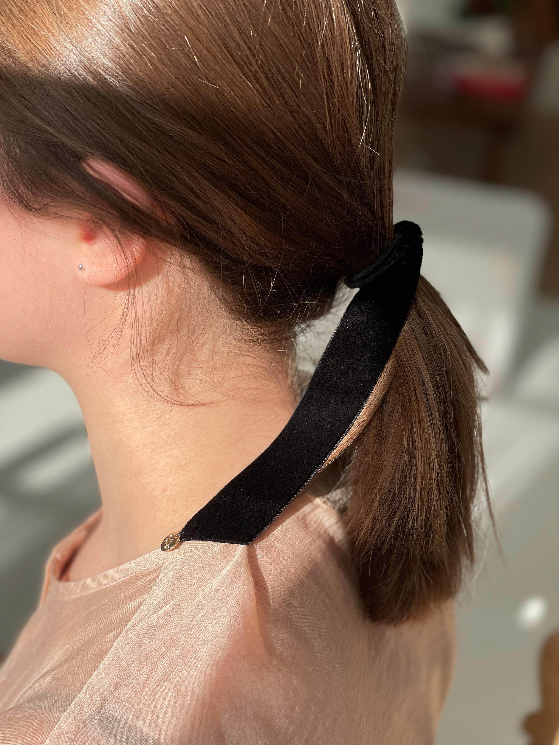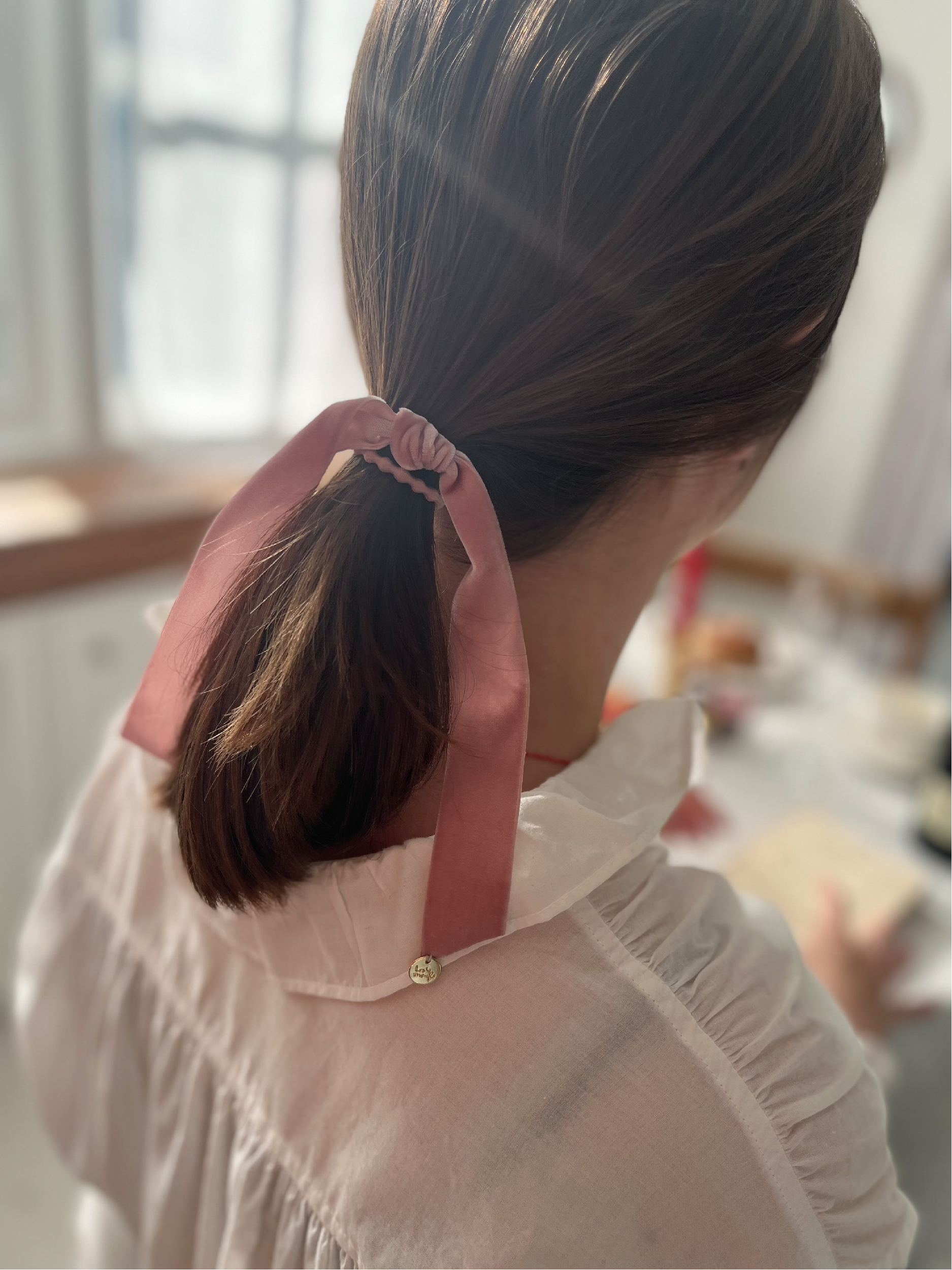 무심히 묶은 헤어에 포인트가 될 수 있는 벨벳 리본과 레메프 로고 메달이 빛나는 헤어스트링입니다 .