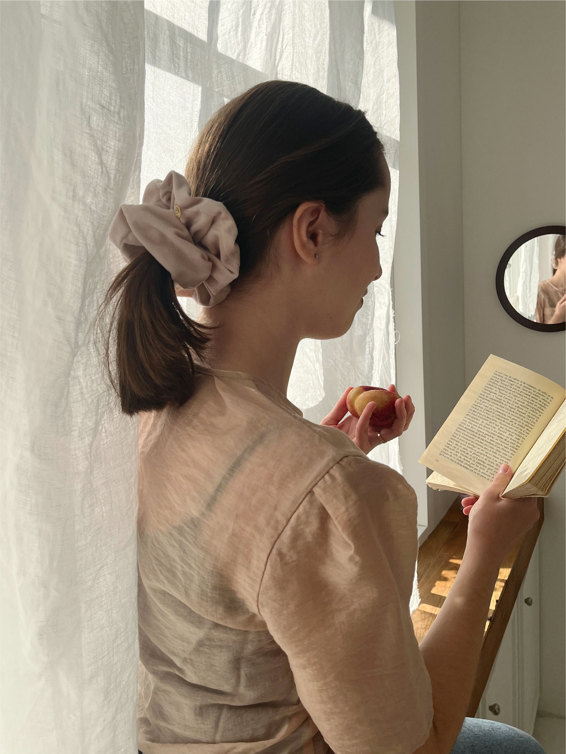 무심히 묶은 헤어에 포인트가 될 수 있는, 레메프 로고 메달이 빛나는 헤어스크런치입니다.