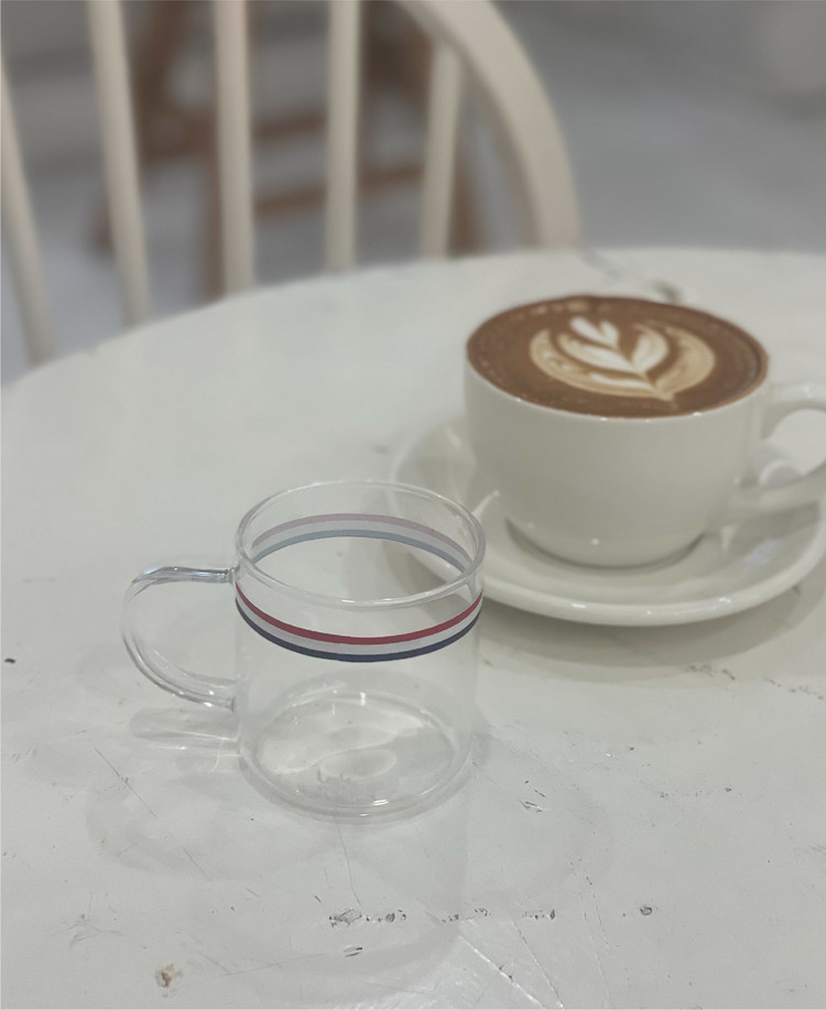 차분한 내열 유리 머그에 레드와 화이트, 블루라인이 둘러져있습니다. 가벼운 손잡이와 부드러운 곡선으로 이어져 있습니다. 귀여운 사이즈로 에스프레소나 작은 음료에 사용해보세요.